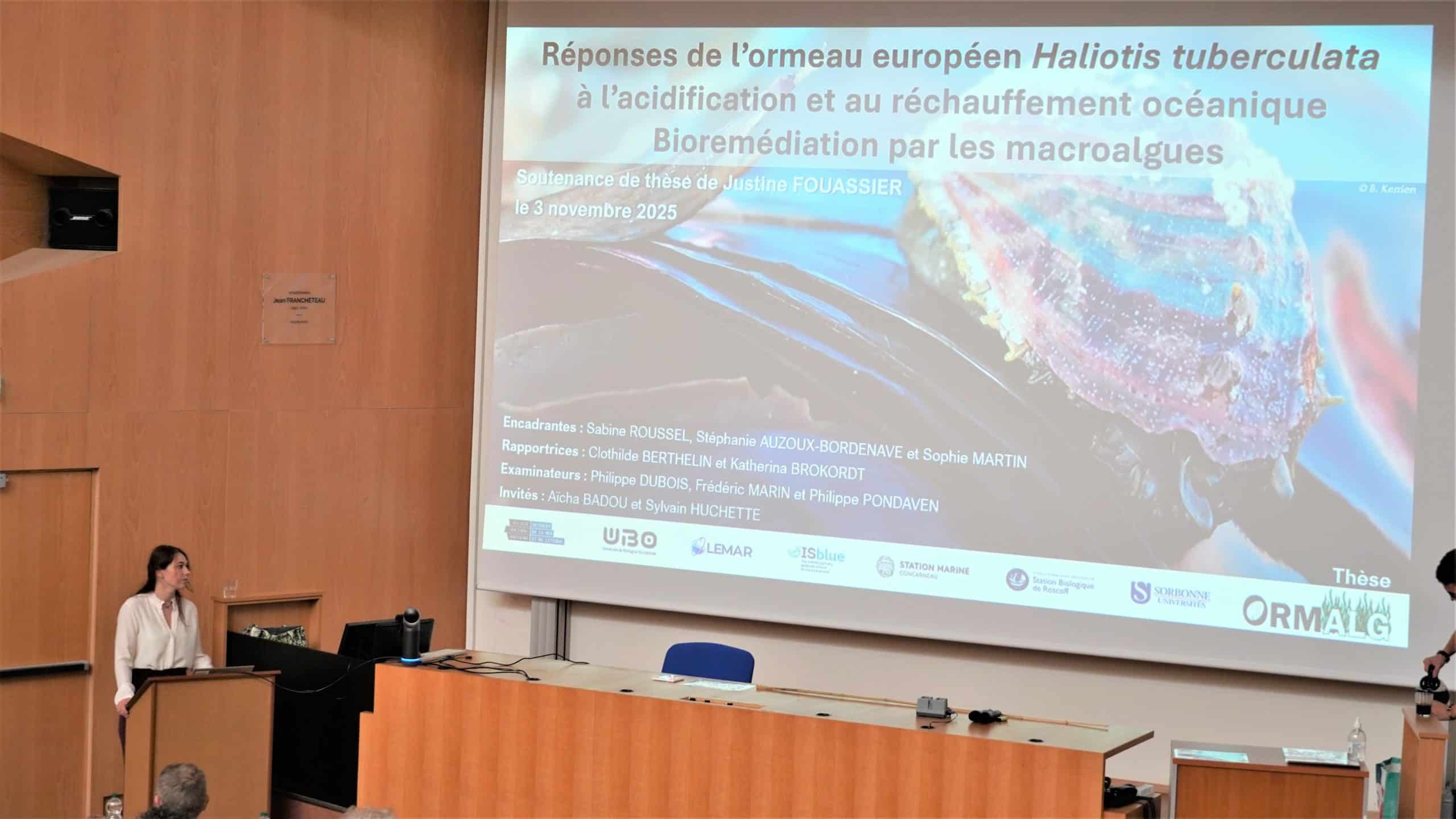 Ce Lundi 3 Novembre 2025, 11 mois après la fin de l’expérience Genormalg réalisée à Océanolab, Justine Fouassier s’est présentée en tant que doctorante devant un jury composé d’experts. 3h30 plus tard, au terme d’une présentation claire et riche en résultats puis d’échanges pointus avec le jury, Justine a été récompensée du titre de docteur en biologie marine de l’Université de Bretagne Occidentale. Un titre qui récompense ses trois années de thèse durant lesquelles elle a étudié l’ormeau et ses conditions de vie sur le terrain et en laboratoire. Elle a par ailleurs étudié une thématique assez novatrice qui visait à tester l’effet dit « de bioremédiation » au changement climatique (notamment l’acidification de l’océan) des macroalgues sur l’ormeau. En d’autres termes, Justine a évalué si la présence d’algues consommatrices de CO2 (la molécule responsable de l’acidification de l’océan) aux côtés de l’ormeau allait diminuer les effets du pH sur ce dernier. Bravo docteur !
