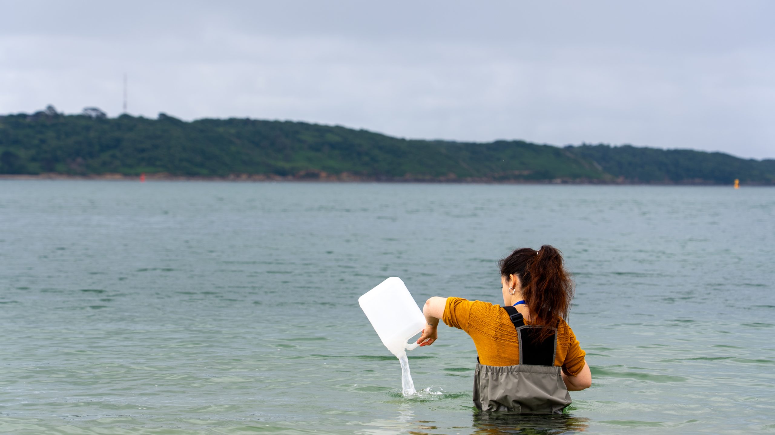 Après une stérilisation des aquariums permettant de limiter une potentielle contamination qui pourrait fausser les résultats de l’expérience, Laura et Maëva partent à la pêche. C’est à côté d’Océanopolis, devant une petite plage que les 2 ingénieures de recherches prélèvent 20L d’eau de mer. Cette zone a été identifiée comme étant assez représentative des espèces que l’on peut retrouver en rade de Brest et à la fois pas directement en contact avec des eaux qui peuvent être polluées par l’homme. De retour au labo, l’eau de mer échantillonnée est passée sur un filet d’une maille de 200 µm pour éliminer les prédateurs du phytoplancton. les deux ingénieures de recherche prélèvent à la marina du Moulin Blanc 20L d’eau de mer concentrés en phytoplancton.