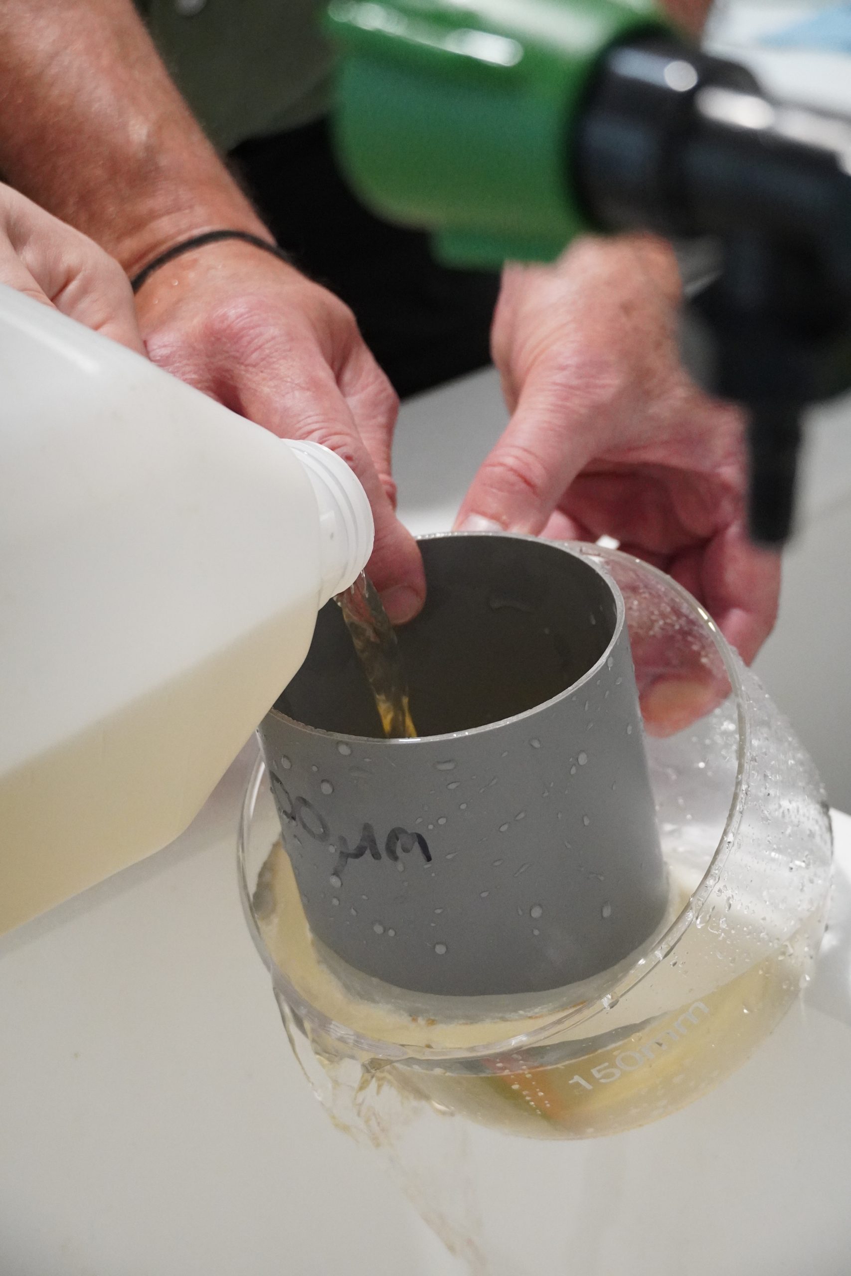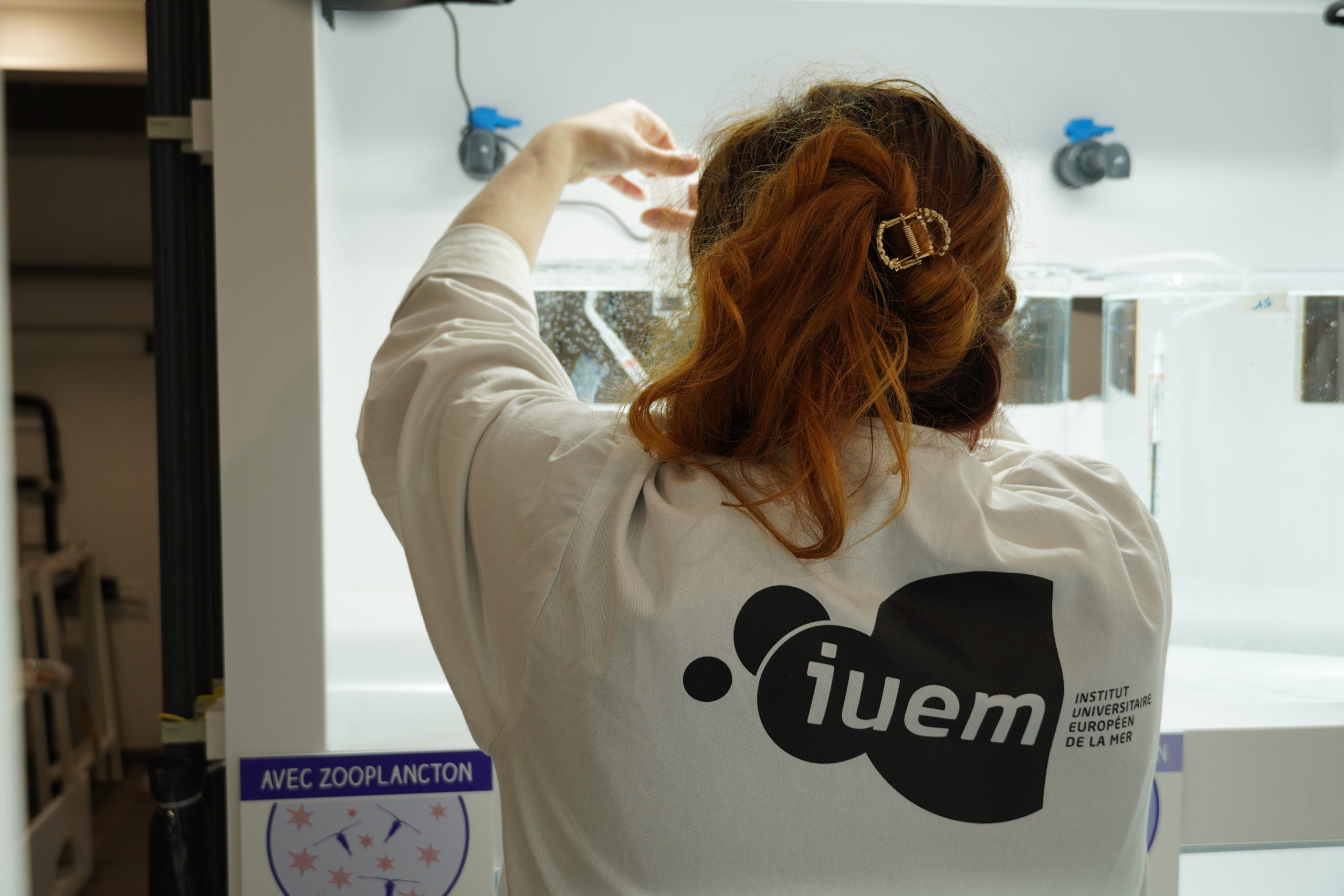 Après une stérilisation des aquariums permettant de limiter une potentielle contamination qui pourrait fausser les résultats de l’expérience, Laura et Maëva partent à la pêche. C’est à côté d’Océanopolis, devant une petite plage que les 2 ingénieures de recherches prélèvent 20L d’eau de mer. Cette zone a été identifiée comme étant assez représentative des espèces que l’on peut retrouver en rade de Brest et à la fois pas directement en contact avec des eaux qui peuvent être polluées par l’homme. De retour au labo, l’eau de mer échantillonnée est passée sur un filet d’une maille de 200 µm pour éliminer les prédateurs du phytoplancton. les deux ingénieures de recherche prélèvent à la marina du Moulin Blanc 20L d’eau de mer concentrés en phytoplancton.